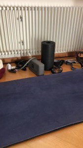 Und dann: täglicher Sport, wenn immer möglich: Krafttraining mit bescheidenen Mitteln in der Sporthalle (Stube) (siehe rechts). Ich bin unterdessen immer besser eingerichtet und belaste ab und zu die Schweizer Post mit Online-Bestellungen für neue Sportartikel. Die von der Post konnten